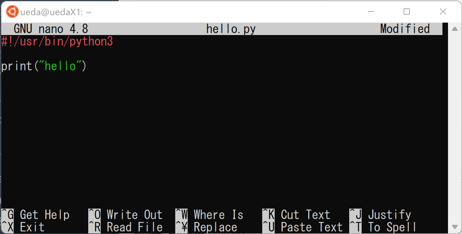 nano hello.pyと端末に打ってエディタを立ち上げ