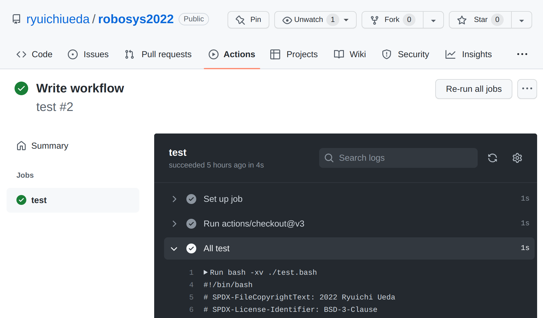test.ymlで$ mkdir .github #robosys2022のリポジトリのトップディレクトリで